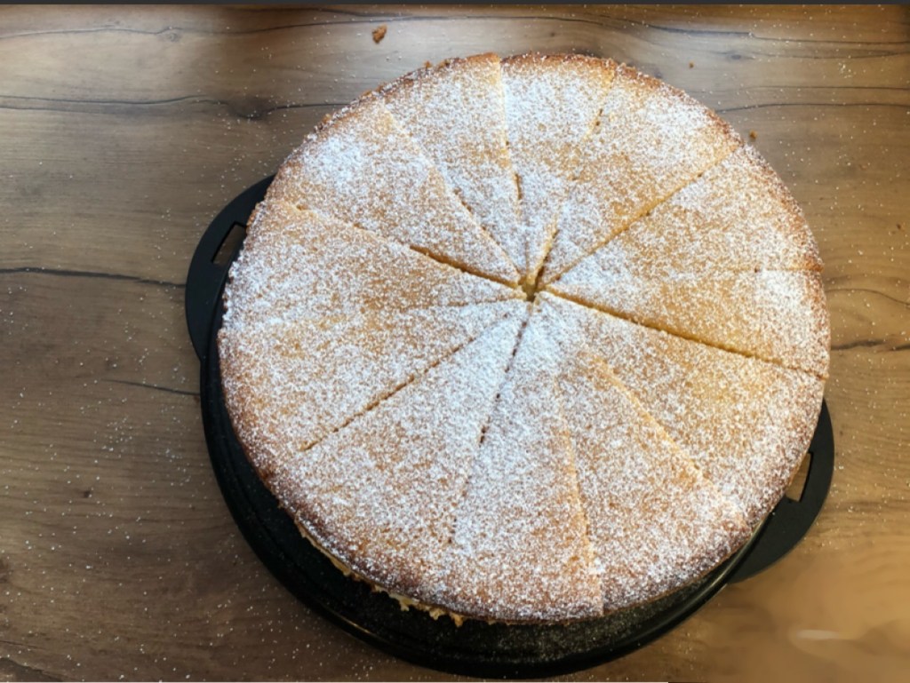 - Bevor die Torte serviert wird, wird sie mit Puderzucker bestäubt.
