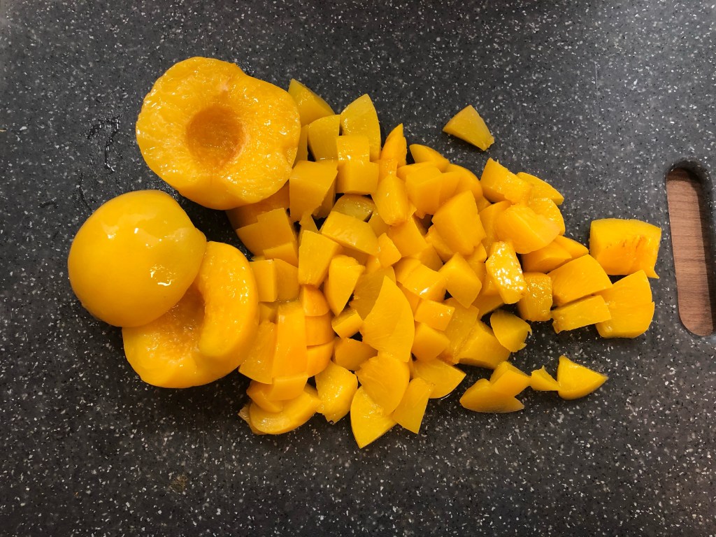 - Die Pfirsiche abtropfen lassen und anschließend halbieren.
