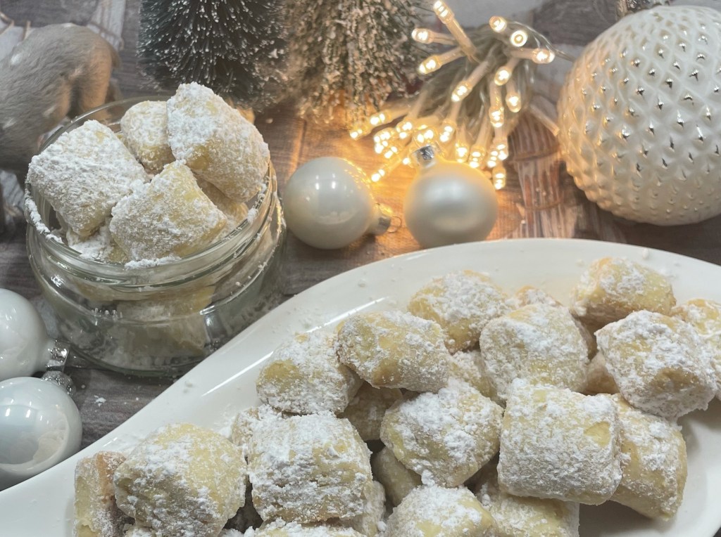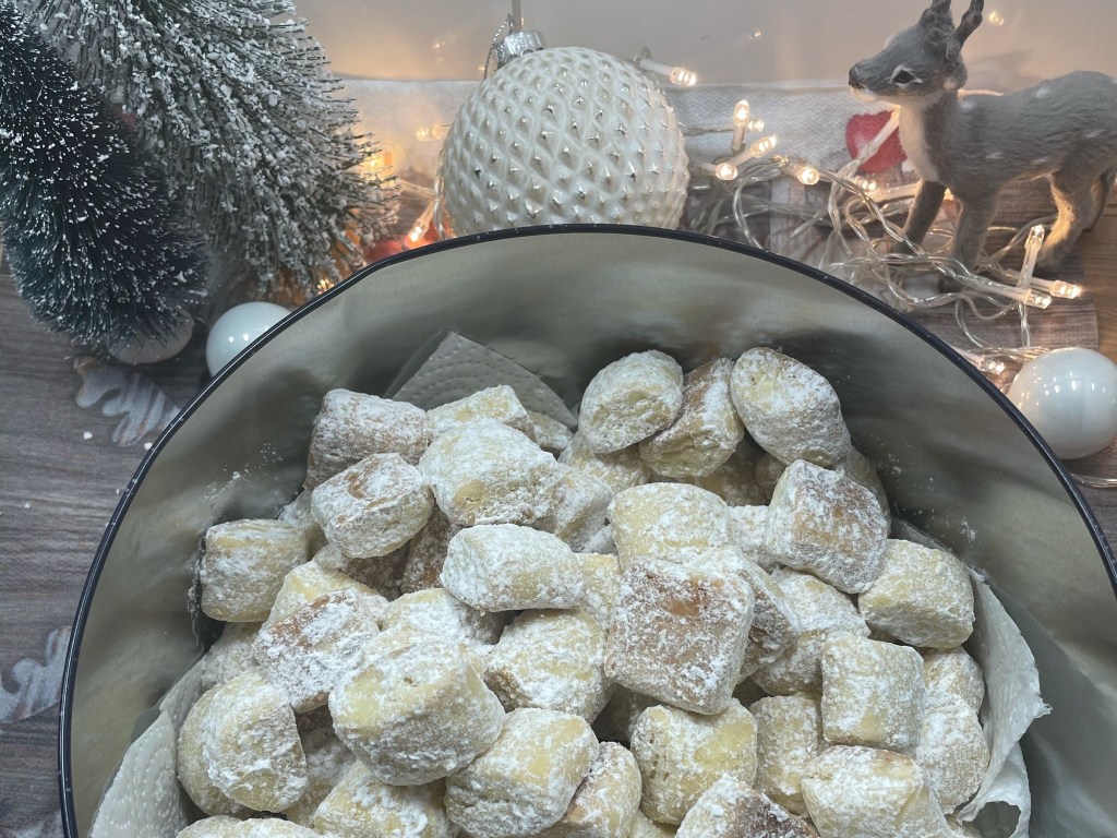 - Die noch warmen Kekse im Puderzucker wälzen. Das geht am einfachsten in einer kleinen Schüssel mit Hilfe eines Löffels.