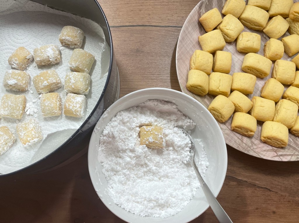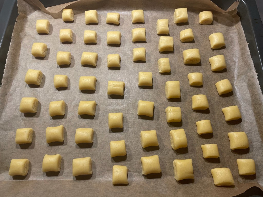 - Aus einer kleinen Menge fingerdicke Stränge rollen und diese in ca 2cm breite Stücke schneiden.