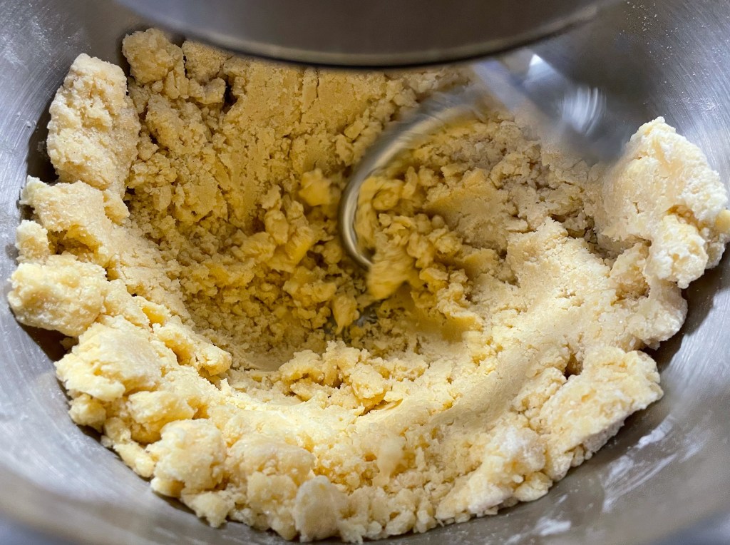 - Die Zutaten werden mit einem Knethaken verrührt.
